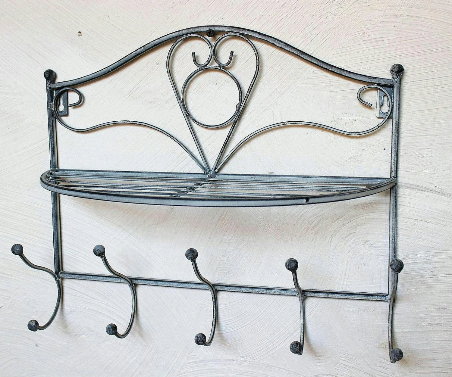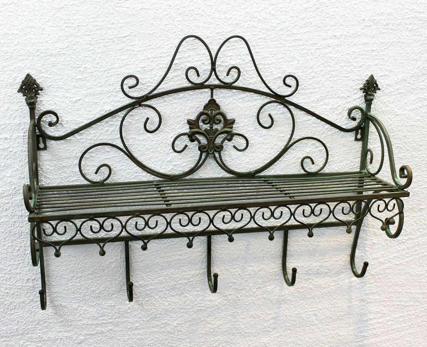 Wandgarderobe Malega – aus Metall geschmiedet. Komplett mit Rostschutzfarbe grundiert und mit hochwertigen Lackfarben lackiert. Farbe – Patina Antik. Maße: Höhe ca. 44 cm, Breite ca. 60 cm, Tiefe ca. 17 cm.