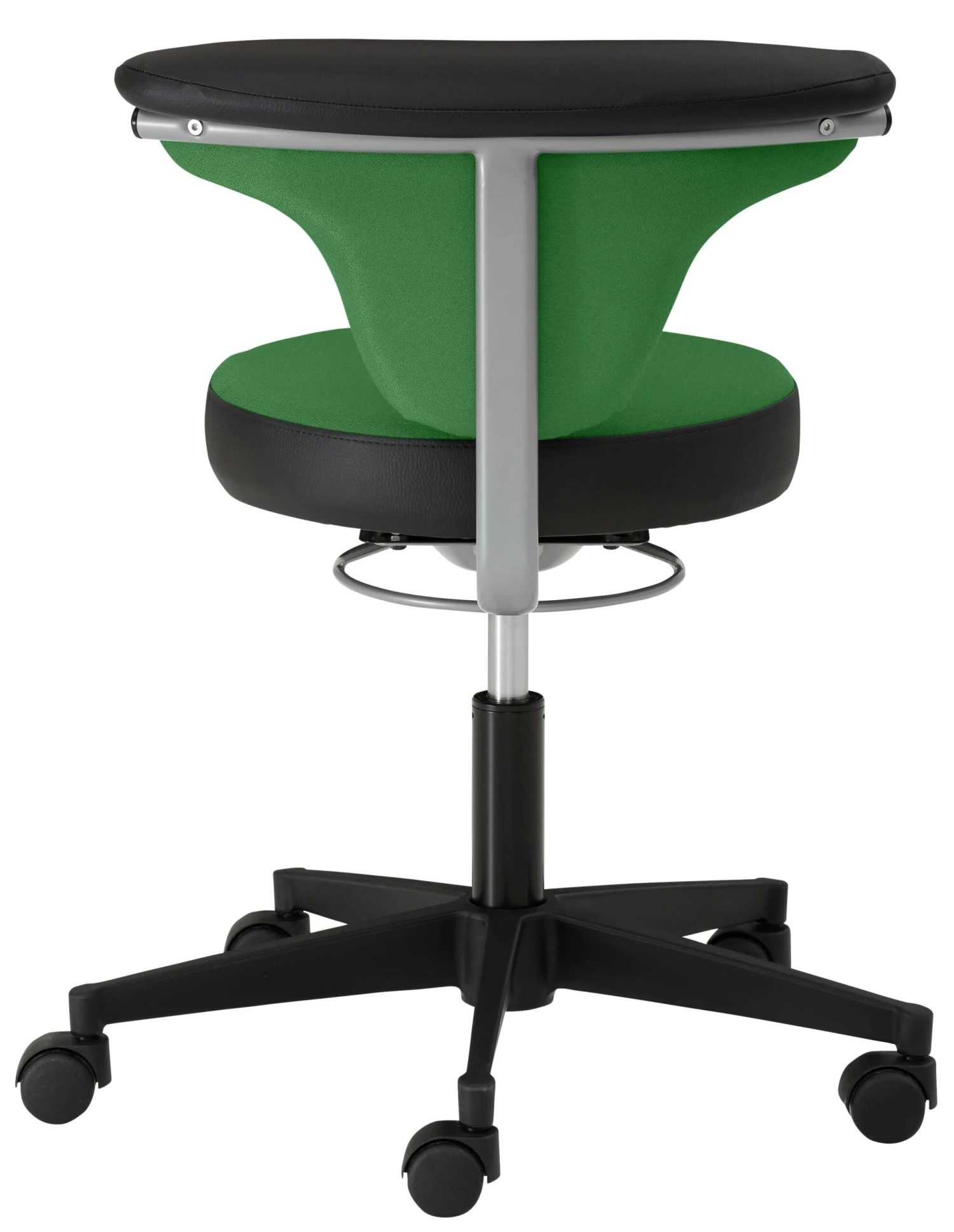 Sitz und Rücken gepolstert, unifarben oder kombiniert lieferbar, Rückenlehne/Armauflage 360° drehbar, stufenlose Höhenverstellung durch Gasfeder, Ringauslösung, Kunststoff-Fußkreuz schwarz (Ø 61 cm), Gestell und Ringauslöser perlsilber, inkl. Rollen für Teppichböden, Sitzhöhe 39 – 50 cm (besonders niedrig), belastbar bis 140 kg.
