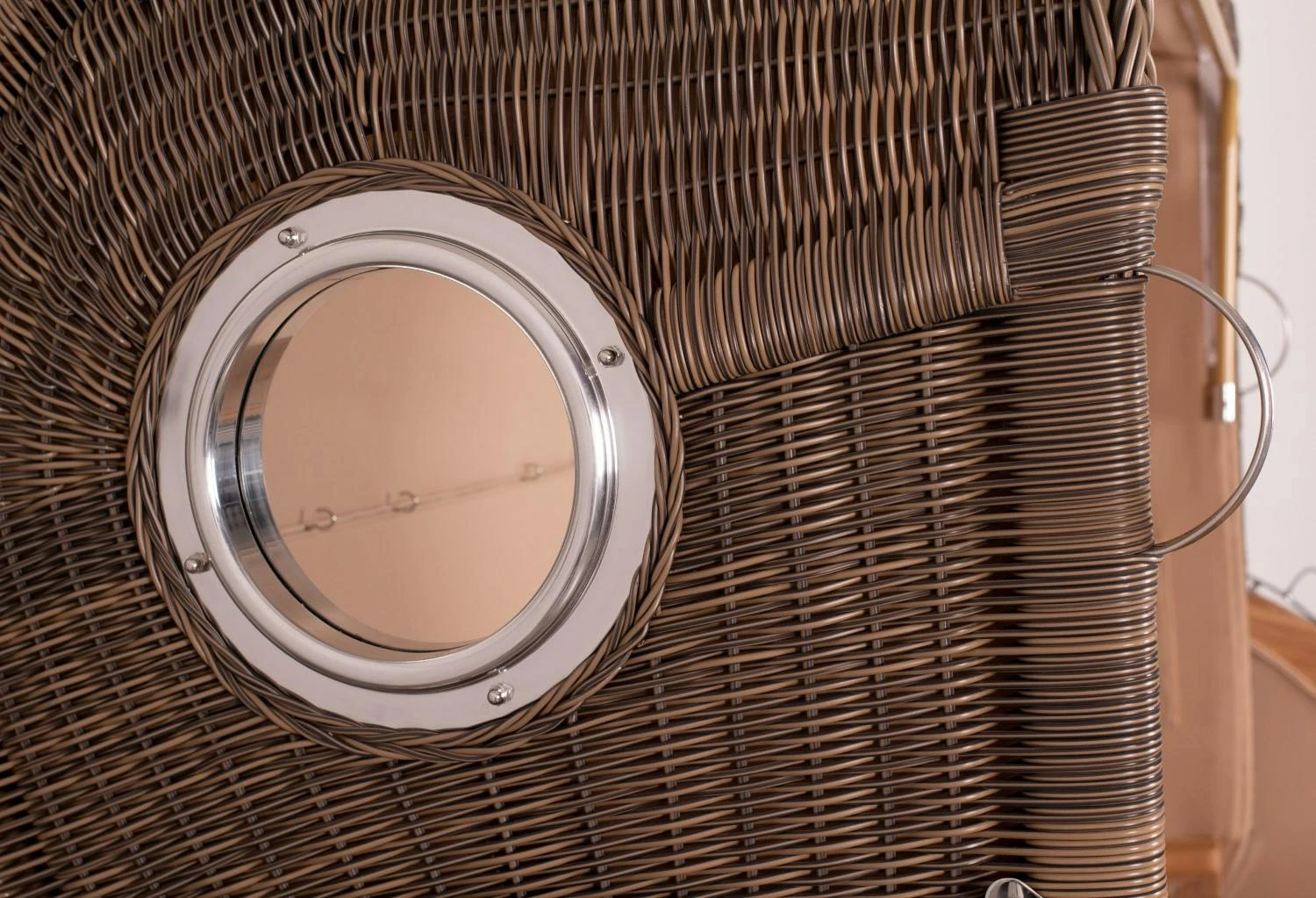 Der extra breite Strandkorb wird aus robustem Plantagen-Teakholz gefertigt und mit stabilen Polyrattangeflecht abgerundet. Das Sonnenflecht-Design des Rattans und die seitlich eingelassenen Aluminium-Bullaugen verleihen dem Strandkorb eine maritime Optik. Die verwendeten Materialien sind nicht nur wetterfest, sondern auch sehr langlebig und pflegeleicht.